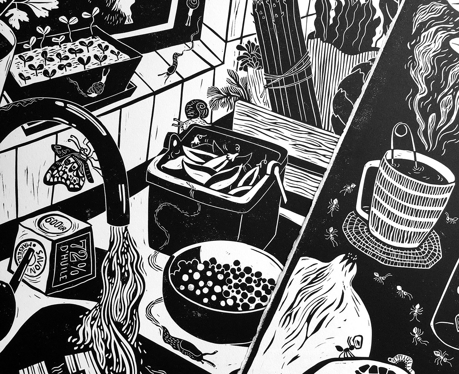 Au menu de cette exposition, Élice nous sert 3 séries d’estampes vitaminées travaillées avec des techniques différentes. À la gouge ou la pointe sèche, dans le lino ou le tetrapak, elle creuse une ligne souple, fluide, toujours en mouvement. Le choix des cadrages et le soucis du détail, influencés par sa formation en illustration/bande-dessinée, amènent souvent une lecture narrative de son travail.
