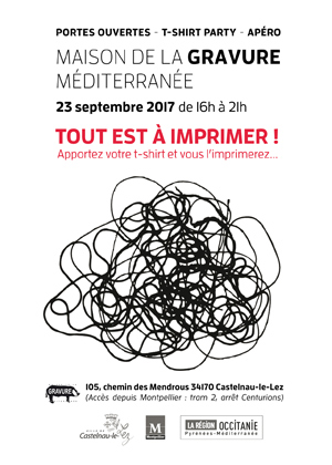 La journée Portes-ouvertes de la Maison de la Gravure Méditerranée se déroulera le samedi 23 septembre. Venez découvrir l’ambiance de notre atelier. Une animation d’impression de t-shirts vous sera proposée. Venez avec votre t-shirt uni (de couleur claire) et vous l’imprimerez!