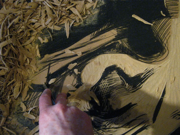 Après avoir tracé un dessin sur une plaque de bois, on en isole les lignes en creusant autour, à l’aide d’un canif ou cutter : c’est le détourage. Puis on évide les parties qui doivent rester blanches à l’impression : c’est le champlevage, d’où le nom de gravure en champlevage exécutée sur bois, dit de fil, que l’on doit graver dans le sens des fibres, technique que nous utilisons en stage.